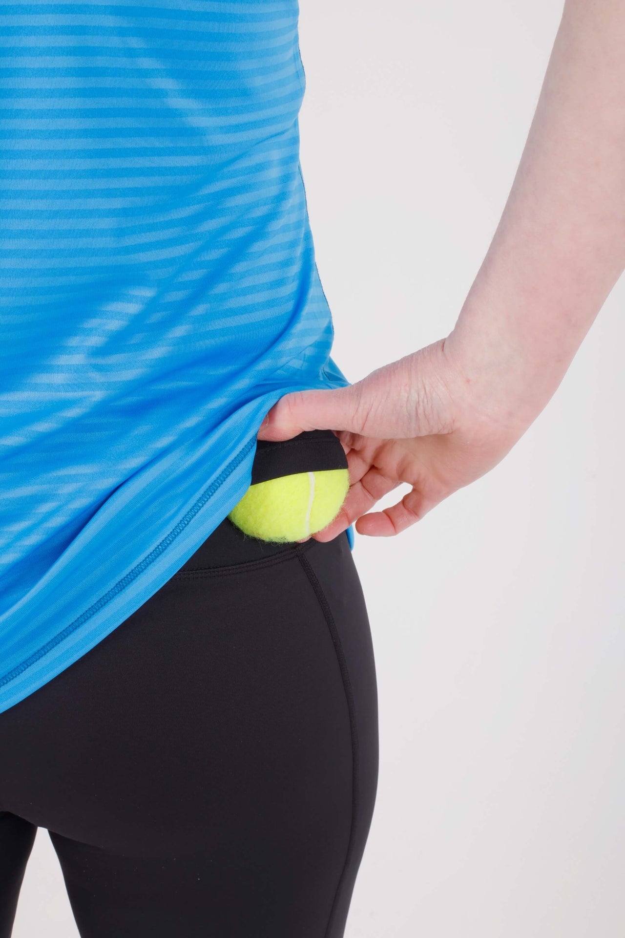 They also have an amazing ball pouch that fits up to 4 tennis balls! It works equally well with pickleballs too. The pouch lets you securely slip tennis balls in and quickly slip them out when needed - it runs the length of the back waistline so it works wonderfully whether you're right or left handed.