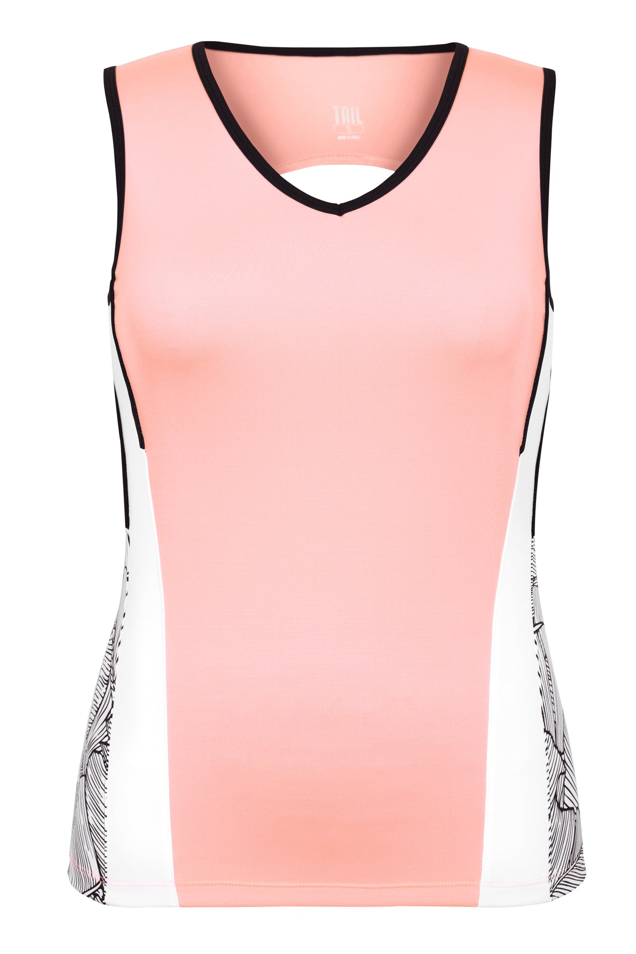 Yet another flattering top by Tail. The Taffy pink fabric has contrasting Folia palm print detailing in a slimming design. The back is especially lovely with its cut out design and contrasting black trim. As you'd expect from tail, the performance fabric is moisture wicking and has UPF50 sun protection.